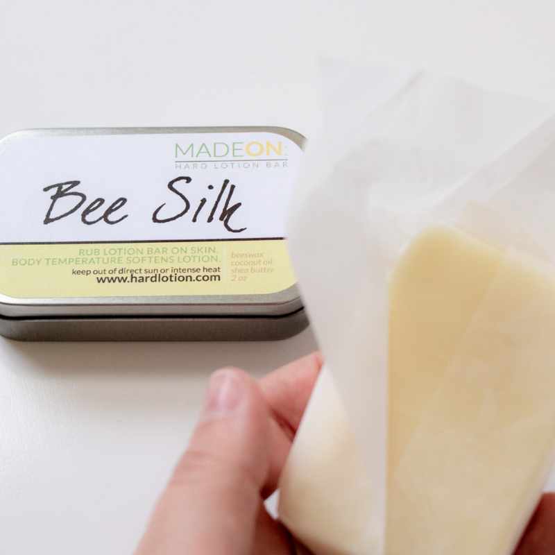 Solid at room temperature, Beesilk hard lotion is designed to specifically protect hands and feet from cracked, dry skin and give it instant relief. Ingredients: 76 degree refined coconut oil, unbleached beeswax, refined shea butter.