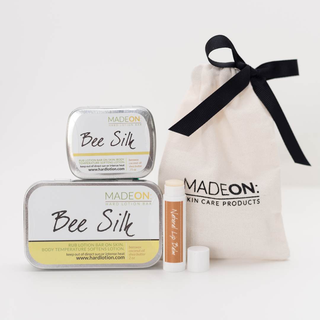 The perfect lotion and lip balm gift set for the traveler heading to dry climates, or the friend with extremely dry skin. This comes with two sizes of Beesilk (full-size and pocket sizes) and a natural lip balm tucked in a cotton gift bag.